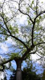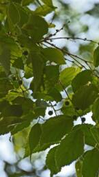 Deciduous tree that can attain a height of 10-30 m, depending on the climate of the area where it grows. It has a smooth grey trunk and a round and broad crown. Its dark green leaves grow alternately, have a short petiole, an ovate to lanceolate shape, an acuminate tip, a serrated margin, and an underside with dense hair and a green-grey color. The root system extends widely to great depths, a trait that allows the tree to survive in drought conditions.