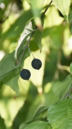A monoecious species with small, greenish-white, scentless, and apetalous hermaphroditic flowers found either singly or in groups in the leaf axils. Flowering takes place from March to April. After fertilization of the flowers, small edible fruits of a dark purple color and a diameter of 1 cm are produced. They are classified as drupes, meaning each fruit contains one round seed. The fruits ripen within September and October.