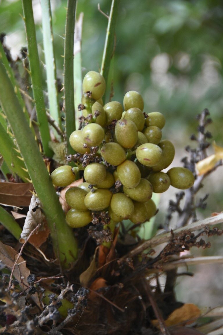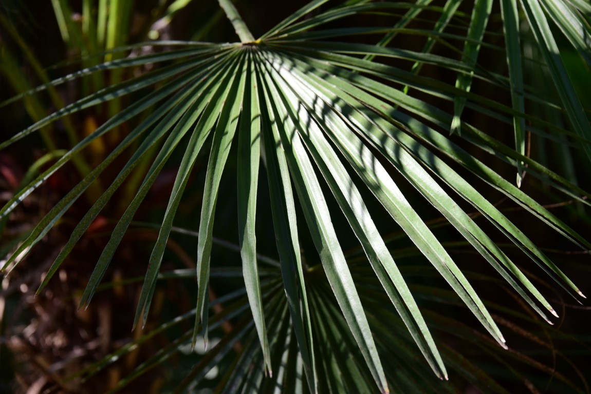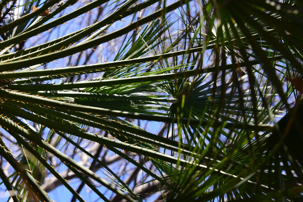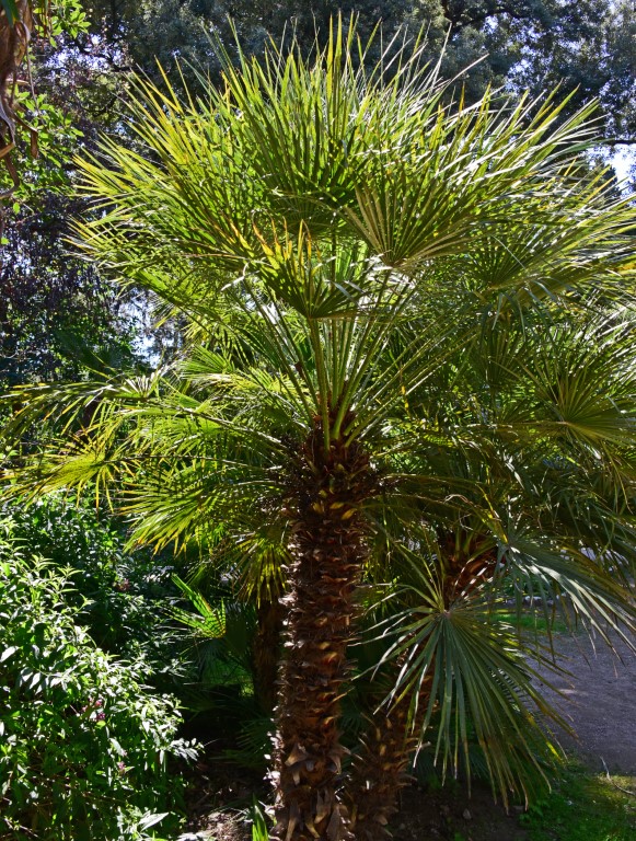 Evergreen palm with a characteristic clumping growth, as multiple shoots emerge from its underground rhizome. Its growth is slow, and the stems usually remain short, spaced closely together, with a height ranging from 2 to 5 meters and a trunk diameter of 20–25 cm, covered with a fibrous “bark.” The roots and underground rhizomes contribute to the formation of new shoots, creating dense, shrub-like clumps. The leaves are palmate, stiff, and petiolate, reaching up to 1.5 meters in length. They bear 10–20 fan-shaped leaflets, 50–80 cm long, with palmate venation and a rough texture. The petioles carry numerous sharp spines, a feature that enhances the plant’s defensive character. The foliage varies in color from light green to silvery-green or bluish-green, forming a dense, hemispherical crown that is particularly striking and recognizable.