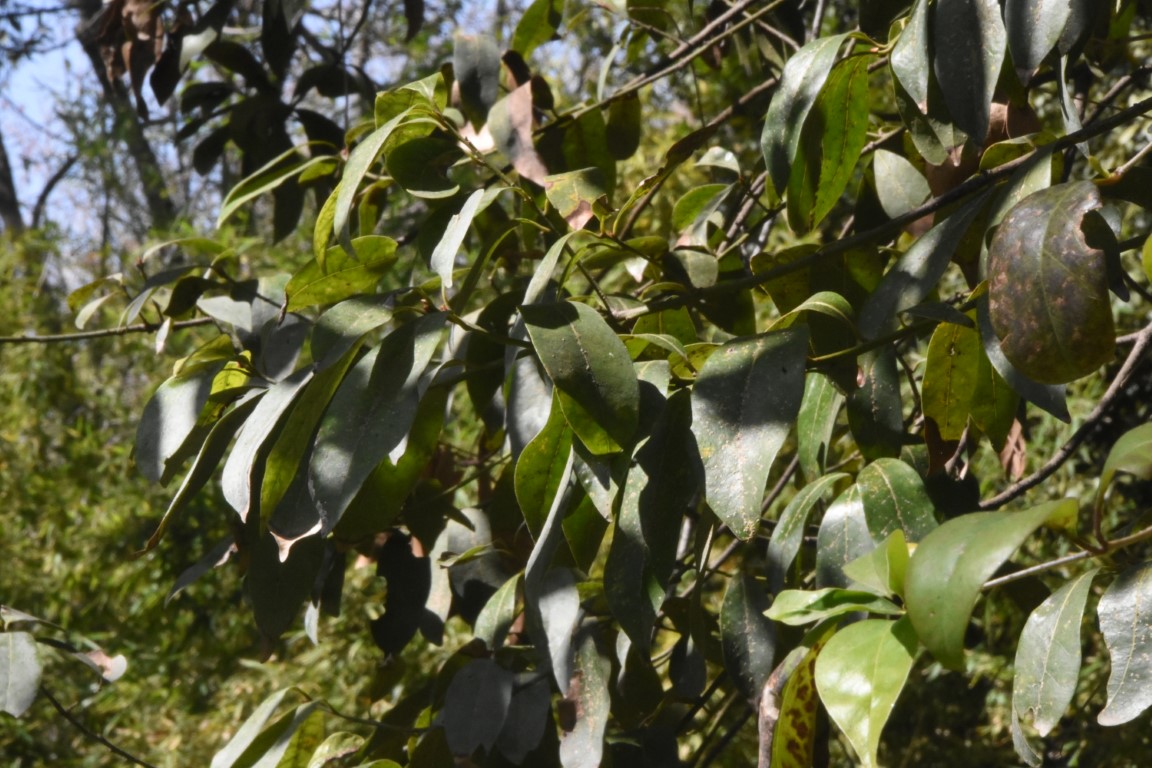 Bitter orange trees are trees 3-10 m in height, with many branches and a round crown. Young shoots are angular and bear thin, short thorns. Older branches have thorns up to 8 cm long. The leaves are simple, alternate, dotted with glands, and aromatic when crushed. They have a petiole 2–3 cm long. The blade is broad, ovate to elliptical, 7-12 cm long and 4-7 cm wide. The species is evergreen, as its foliage is maintained throughout the year. The root system is branched. It extends to great depth, but also along the horizontal axis to a lesser degree, a fact that makes it strong and robust.