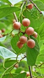 Flowers are small, white, hermaphroditic, organized in corymbs. Flowering takes place from March to May. The fruit of the species is categorized as a drupe. It is spherical, 1–2 cm in diameter, initially green and sticky, and upon maturation acquires a yellow – orange to brown hue. It contains 1 light brown seed per fruit.