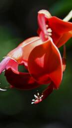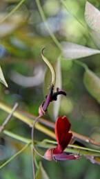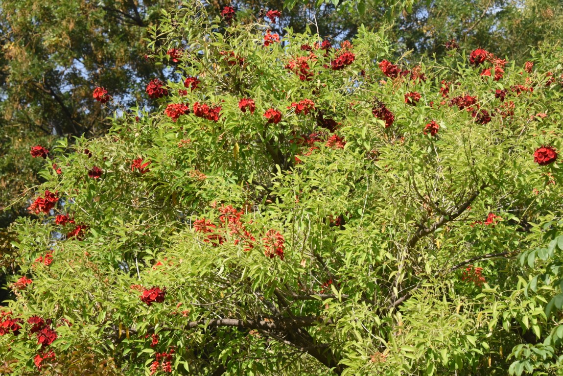 The flowers of the species are hermaphroditic, terminal, pentamerous, and red. They are organized in racemose inflorescences. The flowering period lasts from October to April in South America and from April to October in the northern hemisphere. The fruit is woody, 10-14 cm long and 1-1.5 cm wide. It contains on average 5-10 dark brown to reddish kidney-shaped seeds, 1-1.5 cm in length.
