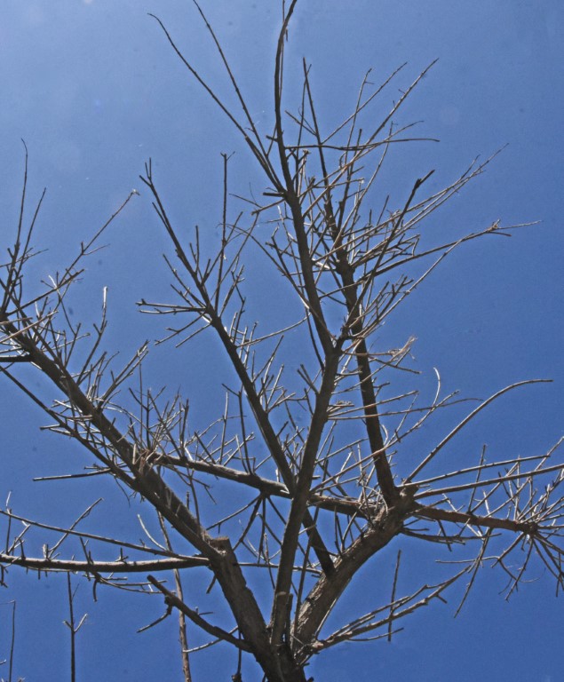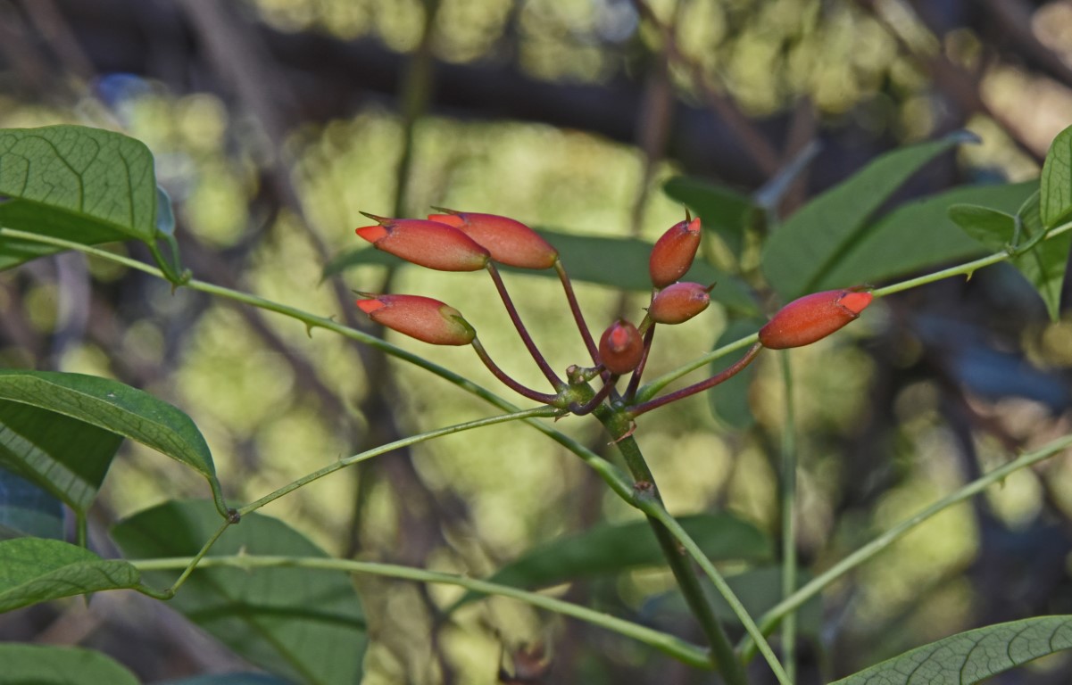 A shrub or small tree with a trunk circumference of approximately 50 cm. The height of the trees ranges between 5 and 8 m, however, individuals reaching 10 m have also been recorded. The woody trunk of the tree bears thorny branches that may approach 50 cm in circumference. The leaves grow alternately, are petiolate and compound, with 3 ovate and acuminate leaflets, each 5-8 cm long and 2-3 cm wide. The species is deciduous, meaning it does not retain its foliage throughout the year. Its root system consists of a taproot. The roots bear nodules produced by nitrogen-fixing bacteria. These bacteria live symbiotically with the tree, facilitating the absorption of nitrogen by the plant in exchange for organic substances necessary for their metabolic processes.
