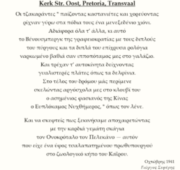 In October 1941, while in Pretoria, the Greek poet George Seferis witnessed the blossoming of the jacaranda trees, an image that inspired his poem “Kerk Str. Oost, Pretoria, Transvaal”. Through this work, he articulates the tragic isolation of the exile who beholds the indifferent prosperity of a foreign land while his own homeland faces collapse.