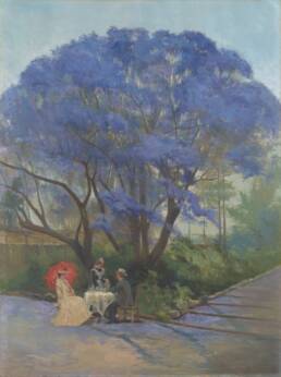 The 1903 painting “Under the Jacaranda” is a work by the Australian artist Godfrey Rivers. The painting depicts Rivers and his wife Selina drinking afternoon tea under a blooming jacaranda in the Brisbane Botanic Gardens, which is considered the first tree of the species in the city, planted by the botanist Walter Hill in the late 19th century.