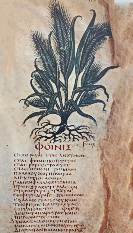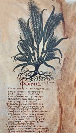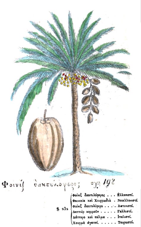Depictions of the palm appear as early as the 2nd millennium BC in Cretan Minoan and Mycenaean art as elements of ritual practices. On a krater dated to 400 BC, Apollo meets Dionysus on Delos with a palm standing between them, while on an Archaic lekythos Apollo is shown holding his lyre and Artemis her bow and quiver, with a palm positioned between the two deities. In Hagia Sophia in Constantinople, the capitals are carved with palm leaves together with acanthus leaves, and similar decoration is also reported for the Temple of Solomon, where gilded representations of palms adorned the central space. The species has been identified in wall paintings from Pompeii and other areas of Italy and is also depicted on the emblem of Saudi Arabia, which consists of two crossed swords with a palm above them. The palm symbolizes growth, vitality, and prosperity. In 1866, Joseph Strauß composed the waltz “Friedenspalmen” (Palms of Peace) on the occasion of the end of the Austro-Prussian War, which resulted in territorial losses for Austria, capturing the population’s exhaustion from war while combining melancholy with joy at the return of life to normality. In his extensive poem “The Palm Tree” (1900), dedicated to G. Drosinis, Kostis Palamas employs the imposing and majestic tree as a symbol of natural perfection. Throughout its 312 verses, he highlights the notion that human thought and art are the defining forces that imbue an otherwise inanimate natural beauty with meaning and spiritual substance.