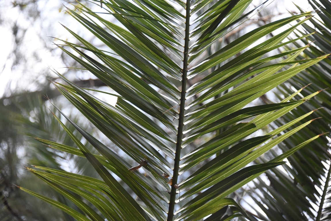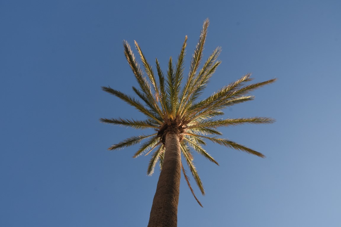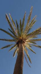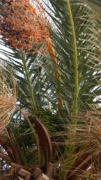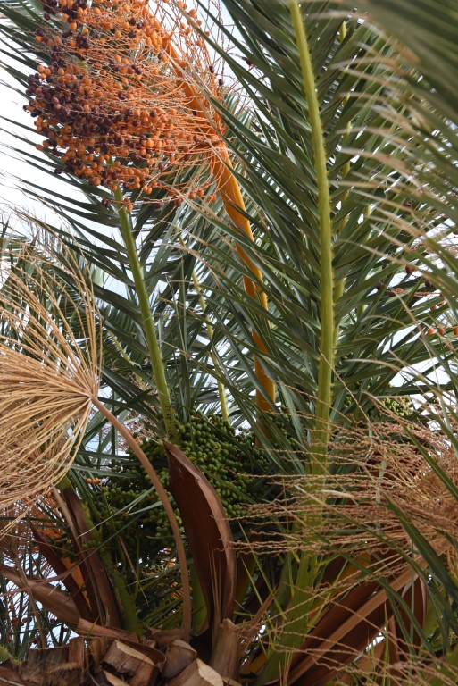 It is a slow-growing evergreen palm tree that can reach a height of 20 to 30 m, with a slender cylindrical trunk of grayish-brown color, bearing the characteristic marks of the bases of old leaves. Its root system is extensive and fibrous, with the ability to produce more than one shoot from the same root system and with the presence of pneumatophorous structures that facilitate gas exchange. The crown is formed at the top of the trunk and has a diameter of 6 to 10 m, consisting of 20 to 40 large leaves that form a spherical to hemispherical canopy. The leaves are compound, pinnate, and reach a length of 5.5 to 6 m, with a petiole bearing spines at the base, and each leaf carries approximately 150 leaflets, 30 to 60 cm long and about 2 cm wide. The leaflets are rigid, leathery, and have a characteristic silvery-green color. The date palm can live for more than 100 years, withstands temperatures down to –10 °C, and requires intense light and sufficient water for its growth.