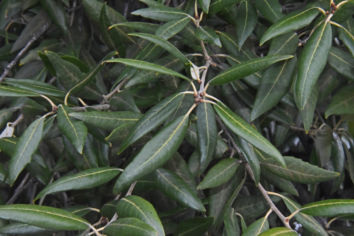 Aειθαλές πλατύφυλλο δέντρο ή θάμνος, με ύψος που συνήθως φτάνει τα 15–25 m, αν και σε ευνοϊκές συνθήκες μπορεί να ξεπεράσει τα 30 m, με κορμό διαμέτρου άνω των 2 m και διάρκεια ζωής που υπερβαίνει τα 1.000 έτη. Η κόμη του είναι πλατιά και θολωτή, με ανυψωμένους κλάδους συχνά χαμηλού ύψους, ενώ ο κορμός είναι κοντός και παχύς. Ο φλοιός είναι παχύς, σκληρός, σκουροπράσινος έως μαυριδερός, ρηχά σχισμένος σε μικρές τετράγωνες πλάκες. Οι νεαροί βλαστοί καλύπτονται από πυκνό σταχτόχρωμο τρίχωμα, το οποίο παραμένει μέχρι τον δεύτερο χρόνο ανάπτυξης. Τα φύλλα είναι δερματώδη και μεταβλητά στο σχήμα, συνήθως λογχοειδή έως ωοειδή, μήκους 4–12 cm και πλάτους 1–6 cm, με βάση στρογγυλεμένη ή σφηνοειδή και κορυφή οξεία. Τα κράσπεδά τους είναι κυματοειδή ή λεία, αλλά σε νεαρά άτομα μπορεί να είναι πριονωτά ή αγκαθωτά. Κατά την έκπτυξη, την Άνοιξη, τα φύλλα είναι αργυρόλευκα, έπειτα κιτρινωπά, καλυμμένα με πυκνό τρίχωμα, το οποίο σταδιακά υποχωρεί, αφήνοντας την άνω επιφάνεια στιλπνή, σκουροπράσινη έως σχεδόν μαύρη, ενώ η κάτω πλευρά παραμένει σταχτόχρωμη ή καστανόχρωμη. Ο μίσχος έχει μήκος 1–2 cm και είναι επίσης τριχωτός. Τα φύλλα διατηρούνται για 1 έως 4 έτη, ανάλογα με τη θέση τους στην κόμη και τις περιβαλλοντικές συνθήκες.