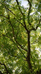 Ημιφυλλοβόλο δέντρο που μπορεί να φτάσει τα 20–30 m σε ύψος, ενώ σε ευνοϊκές συνθήκες έχει αναφερθεί ότι φτάνει έως και τα 40 m, με διάμετρο κορμού έως 1,5 m. Διακρίνεται για την πλατιά, ελαφριά και εκτεταμένη κόμη του, η οποία συχνά ξεπερνά σε εύρος το ύψος του, προσφέροντας άφθονη σκιά. Ο κορμός είναι κυλινδρικός, με ερυθροκάστανο φλοιό που με την ηλικία ρηγματώνεται και απολεπίζεται, ενώ ο φλοιός των κλάδων είναι πιο γκρίζος και σχισμένος. Όταν κοπεί, εκκρίνει κοκκινωπή, κολλώδη ρητίνη. Το ξύλο του είναι υπόλευκο, σκληρό και ινώδες. Τα φύλλα είναι σύνθετα, κατ’ εναλλαγήν, πτεροειδή, μήκους έως 25 cm, με 7–19 φυλλάρια μήκους 2–7 cm το καθένα. Τα φυλλάρια είναι ελαφρά πράσινα, στενά ελλειπτικά έως επιμήκη, με ακέραιες παρυφές και στρογγυλεμένη ή ελαφρώς εγκοπτόμενη κορυφή, ενώ στη βάση φέρουν μικρό μίσχο και διογκωμένο ποδίσκο. Το είδος διαθέτει ρηχές ρίζες, γεγονός που το καθιστά ευαίσθητο σε δυνατούς ανέμους, ενώ σε πολλές περιοχές ρίχνει τα φύλλα του από τα μέσα του χειμώνα έως την άνοιξη, ανάλογα με τις τοπικές κλιματικές συνθήκες.