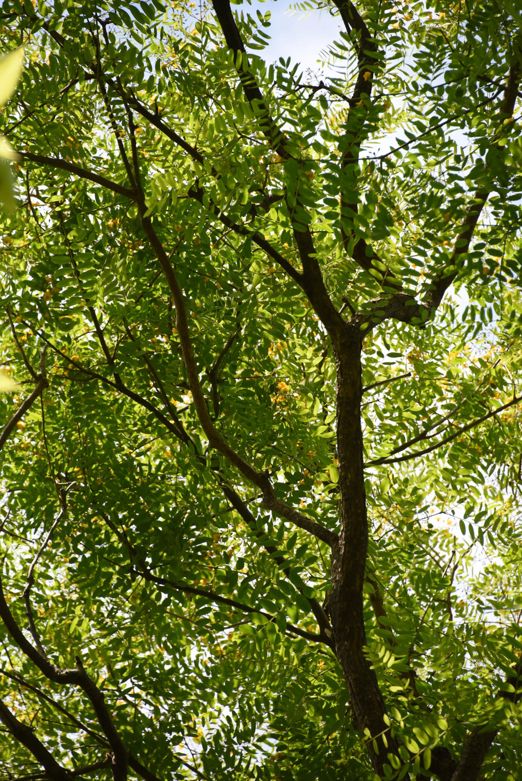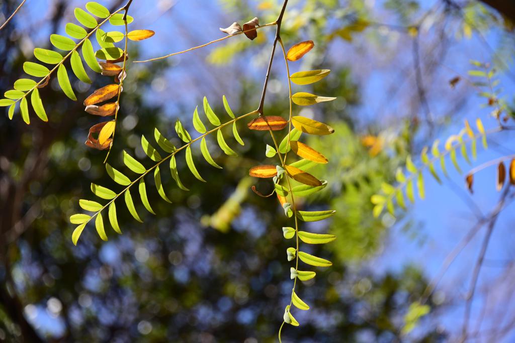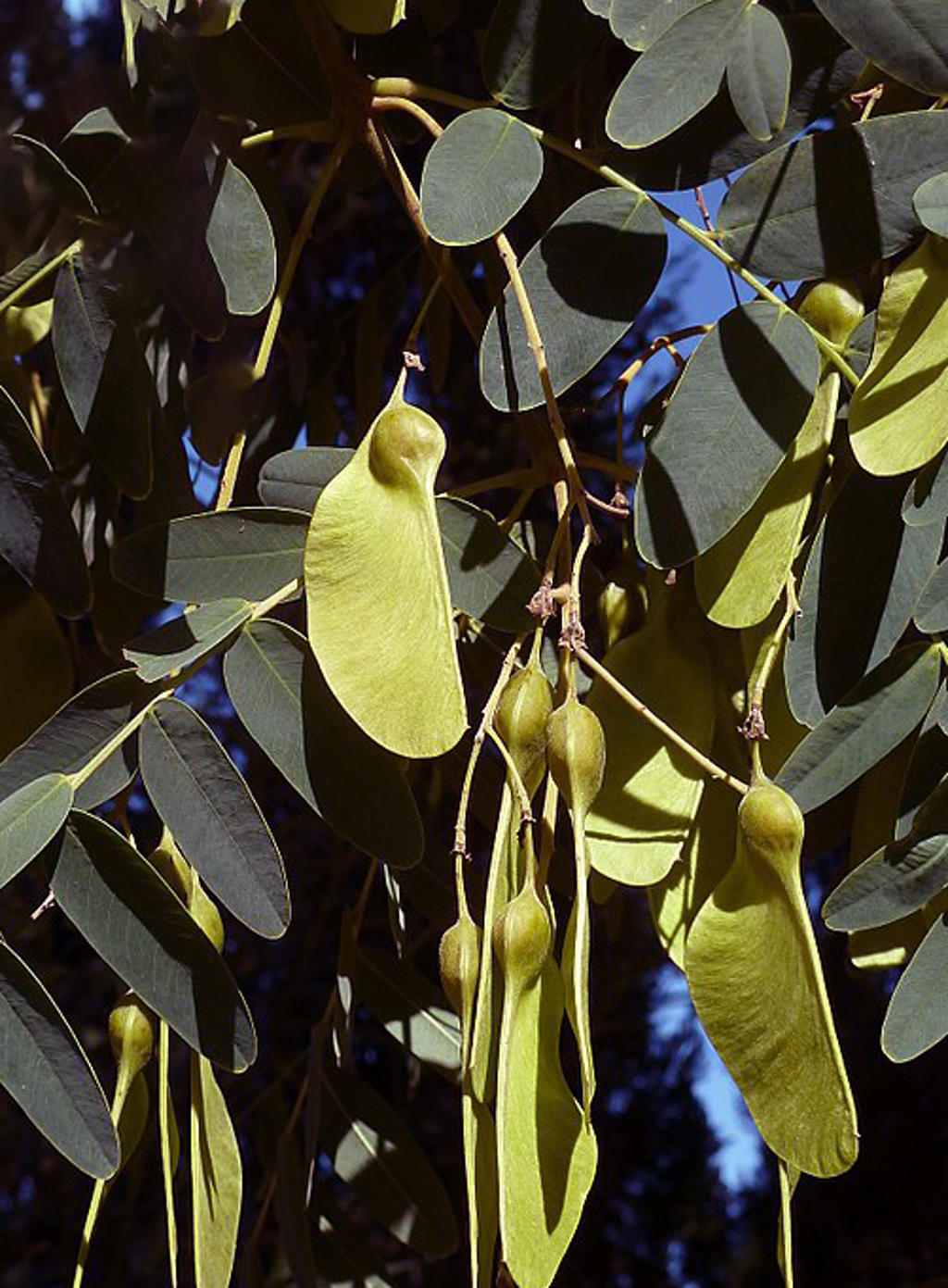 Ημιφυλλοβόλο δέντρο που μπορεί να φτάσει τα 20–30 m σε ύψος, ενώ σε ευνοϊκές συνθήκες έχει αναφερθεί ότι φτάνει έως και τα 40 m, με διάμετρο κορμού έως 1,5 m. Διακρίνεται για την πλατιά, ελαφριά και εκτεταμένη κόμη του, η οποία συχνά ξεπερνά σε εύρος το ύψος του, προσφέροντας άφθονη σκιά. Ο κορμός είναι κυλινδρικός, με ερυθροκάστανο φλοιό που με την ηλικία ρηγματώνεται και απολεπίζεται, ενώ ο φλοιός των κλάδων είναι πιο γκρίζος και σχισμένος. Όταν κοπεί, εκκρίνει κοκκινωπή, κολλώδη ρητίνη. Το ξύλο του είναι υπόλευκο, σκληρό και ινώδες. Τα φύλλα είναι σύνθετα, κατ’ εναλλαγήν, πτεροειδή, μήκους έως 25 cm, με 7–19 φυλλάρια μήκους 2–7 cm το καθένα. Τα φυλλάρια είναι ελαφρά πράσινα, στενά ελλειπτικά έως επιμήκη, με ακέραιες παρυφές και στρογγυλεμένη ή ελαφρώς εγκοπτόμενη κορυφή, ενώ στη βάση φέρουν μικρό μίσχο και διογκωμένο ποδίσκο. Το είδος διαθέτει ρηχές ρίζες, γεγονός που το καθιστά ευαίσθητο σε δυνατούς ανέμους, ενώ σε πολλές περιοχές ρίχνει τα φύλλα του από τα μέσα του χειμώνα έως την άνοιξη, ανάλογα με τις τοπικές κλιματικές συνθήκες.
