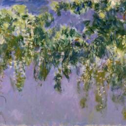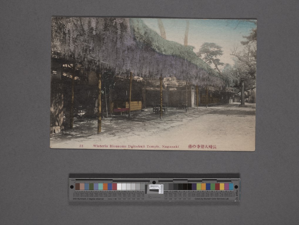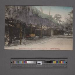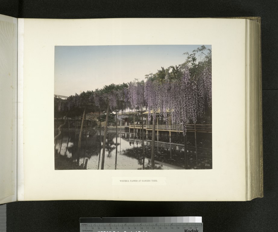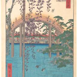 Ο ναός Kameido Tenjin στο Τόκιο, συνιστά εμβληματικό τοπόσημο της ιαπωνικής εικονογραφίας, όπου το φυσικό περιβάλλον μετουσιώνεται σε ένα πολυσύνθετο αρχιτεκτονικό και καλλιτεχνικό οικοδόμημα. Μάλιστα, από τα μέσα του 17ου αιώνα μέχρι και σήμερα, τον Απρίλιο, διεξάγεται το “Kameido Tenjin Wisteria Festival”. Η φύτευση της γλυτσίνας κατά την περίοδο Edo (1603-1868) υπερβαίνει τα όρια της κηπουρικής παρέμβασης, αποτελώντας μια συνειδητή αισθητική απόδοση της έννοιας “mono no aware (物の哀れ) – της βαθιάς συγκίνησης απέναντι στην εφήμερη φύση των πραγμάτων”. Στο πλαίσιο της παράδοσης ukiyo-e (εικόνες του επιπλέοντος κόσμου), ο Utagawa Hiroshige απαθανάτισε τις χαρακτηριστικές κρεμαστές ταξιανθίες και την τοξωτή γέφυρα του ναού, εντάσσοντάς τες στην περίφημη σειρά του “Εκατό Διάσημες Απόψεις του Έντο”. Μέσα από μια καινοτόμο γωνία θέασης, όπου τα άνθη λειτουργούν ως φυσικό πλαίσιο, ο καλλιτέχνης αξιοποίησε την αντανάκλαση στο υδάτινο στοιχείο για την επίτευξη οπτικού βάθους και χρωματικής ισορροπίας. Η σύνθεση αυτή μετέτρεψε το τοπίο σε ένα «ζωντανό» έργο τέχνης, όπου η διαλεκτική σχέση των ιώδων τόνων με το νερό καθιερώθηκε ως διαχρονικό σύμβολο κομψότητας (miyabi) και ευγένειας.